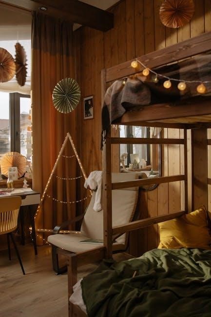 Position the ladder at the desired side of the bunk bed frame, ensuring it aligns with the pre-drilled holes or mounting brackets. Secure the ladder using the provided bolts or screws, tightening them firmly to prevent movement. Double-check the ladder’s stability by gently rocking it side to side. Ensure the ladder’s feet are fully contacting the floor for added balance. If included, attach any additional safety features, such as non-slip strips or stabilizing brackets. Once installed, test the ladder by climbing carefully to confirm it feels sturdy and secure. Proper attachment ensures safe access to the top bunk, reducing the risk of accidents. Always follow the manufacturer’s specific instructions for ladder placement and installation.